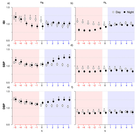 Day–Night comparison of multifractal short- and long-term coefficients. (a) Short-term coefficients, αS(q), for IBI in Day (open circles) and Night (solid circles) periods and for −5 ≤ q ≤ +5: median ±standard error of the median over N = 14 participants; the * indicates Day vs. Night differences significant at p < 0.05; (b) long-term coefficients, αL(q), of IBI represented as in panel (a); (c) short-term coefficients of SBP and (d) long-term coefficients of SBP, represented as in panel (a); (e) short-term coefficients and (f) long-term coefficients of DBP, represented as in panel (a).