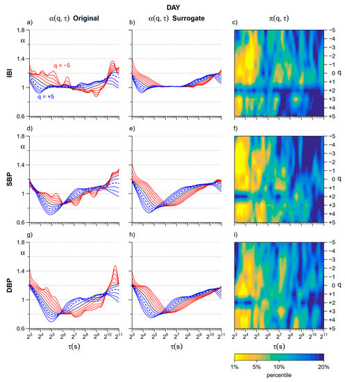 Assessment of nonlinearity during daytime. Upper panels refer to IBI: (a) α(q,τ) coefficients for the original series (average over N = 14 participants, see panel (a) for line colors); (b) α(q,τ) for the corresponding phase-randomized surrogate series; (c) color map of the percentile of the distribution of surrogate estimates in which is the original estimate (average over N = 14 participants). Mid panels refer to SBP: (d) α(q,τ) for the original series; (e) α(q,τ) for the corresponding surrogate series; (f) color map of percentiles. Lower panels refer to DBP: (g) α(q,τ) for the original series; (h) α(q,τ) for the corresponding surrogate series; (i) color map of percentiles.
