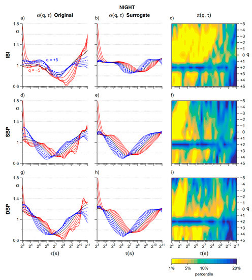Assessment of nonlinearity during night-time. Upper panels refer to IBI: (a) α(q,τ) for the original series (average over N = 14 participants, see panel (a) for of line colors), (b) α(q,τ) for the corresponding phase-randomized surrogate series, and (c) color map of the percentile of the distribution of surrogate estimates in which is the original estimate (average over N = 14 participants). Mid panels refer to SBP: (d) α(q,τ) for the original series; (e) α(q,τ) for the surrogate series; (f) color map of percentiles. Lower panels refer to DBP: (g) α(q,τ) for the original series; (h) α(q,τ) for the surrogate series; (i) color map of percentiles.