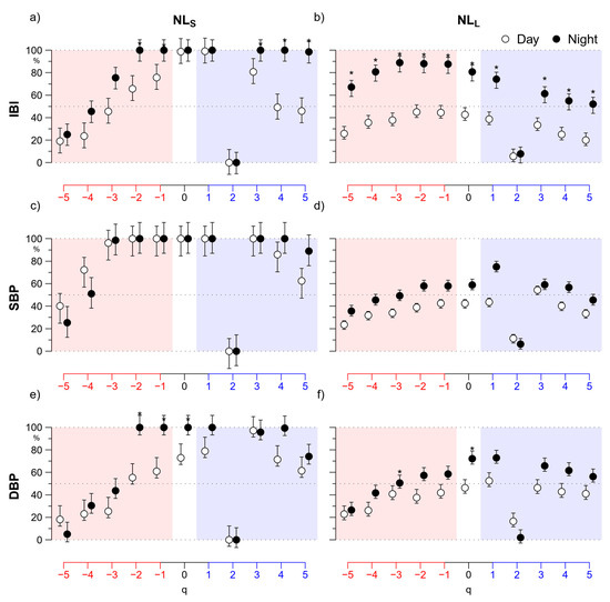 Day vs. Night comparison of short-term and long-term indices of nonlinearity. (a) Short-term index, NLS(q), for IBI in Day (open circles) and Night (solid circles) periods and for −5 ≤ q ≤ +5: median ±standard error of the median over N = 14 participants; the * indicates Day vs. Night differences significant at p < 0.05; (b) long-term nonlinearity index, NLL(q), of IBI; (c) short-term and (d) long-term nonlinearity index of SBP; (e) short-term and (f) long-term nonlinearity index of DBP.
