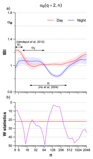 Day–night comparison of the multiscale monofractal DFA coefficients of IBI plotted vs. the block size n in beats. (a) αB(q,n) calculated for q = 2 (second-order moment of the monofractal DFA) during daytime (red) and nighttime (blue): mean +/− sem over the group of N = 14 participants; the arrows indicate the scale ranges for estimating α1 and α2 as defined by Vanderput et al. in [31] and for estimating α as defined by Hu et al. in [30]. (b) W statistics for the day-night difference in αB(2,n); when W is above the red horizontal line, the difference at the corresponding scale is significant at p < 5%.