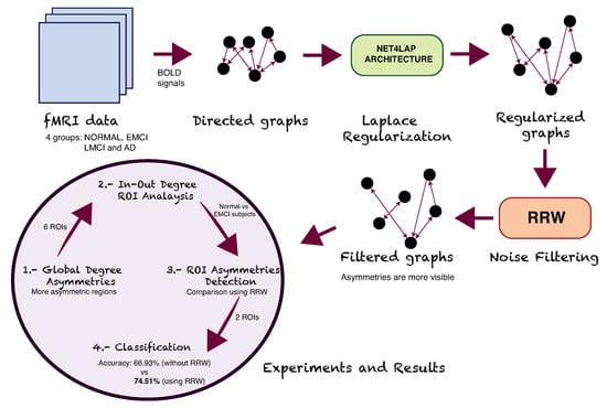 Our proposal: the input data (fMRI data) is transformed to directed graphs and classified in 4 groups (NORMAL, EMCI, LMCI and AD), and then we have applied a graph preconditioning process (Laplace regularization using Net4Lap Architecture and a noise filtering through RRW) to find degree asymmetries in different regions of the brain.
