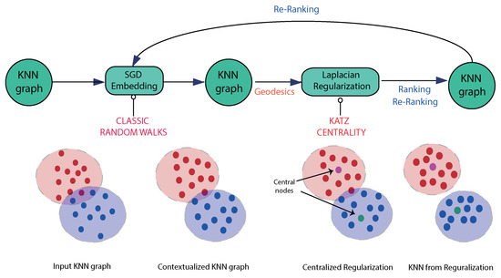 A modified kNN graph based on the embedding is more locally isotropic and harmonic than the original one. This modified graph is fed into a Laplacian regularizer based on global centrality. The result is a new kNN graph based on node ranking relationships that is re-fed into the stochastic gradient descent neural model for a re-ranking cycle.
