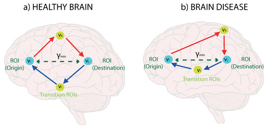 Several studies of the early clinical diagnosis of Alzheimer’s disease suggest that there exists asymmetries between right and left brain hemisphere in specific regions of the brain [17,18,19,20], and so there is an imperative to develop methods of analysis that can be used to understand the pattern of asymmetries. In other words, the structure of the directed networks representing the activation patterns needs to be better understood to find the differences between healthy brains and those showing early signs of Alzheimer’s disease when signal noise is present. To reduce the effects of BOLD signal noise and the resulting confusion in the inferred interaction structures between different brain regions, we propose to use a powerful unsupervised network analysis tool, namely the Return Random Walk [21,22]. This method allows us to reduce the inter-class noise while increasing the density of the structure through intra-class link prediction. However, this method uses undirected graphs and it needs a pre-processing step to obtain a better-conditioned input graph (directed network).