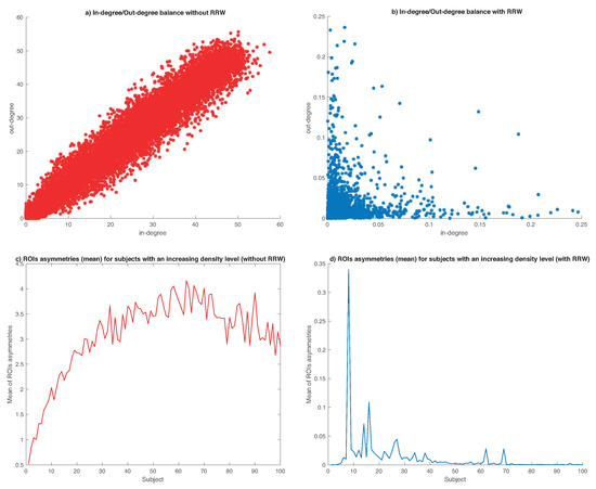 As complementary experiments, we select a random subset of 100 subjects and we represent (in density ascending order) their sum of degree differences (in-degree and out-degree) of all ROIs of each subject. A high value of this sum means a more asymmetric distribution (affected brain). In Figure 4c,d, we can see how the asymmetries are higher with denser graphs (in Figure 4c), but after applying RRW (in Figure 4d) we increment the asymmetry of dense graphs (sparse graphs), and increase the possibility of detecting and classify between healthy and affected patients.