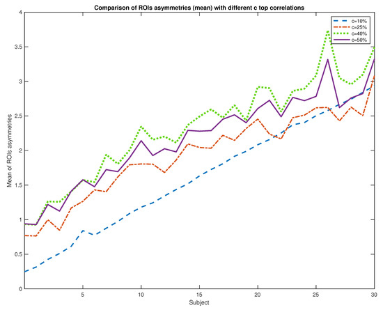 In the following subsection, we can see the difficulty of differentiating between healthy patients and the early stages of the Alzheimer disease due to the disconnection of links of the graph structure (sparse graphs). For a correct study, we retain the highest c correlation coefficients. For that, we select a subset with the 30 sparser subjects, and we compare the evolution of asymmetries (in decreasing sparse order) with different coefficients values ( and ) in Figure 5. We choose the threshold (maximize the asymmetries to make easier subsequent tasks as classification).