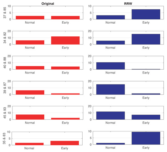 In the first experiment, we analyze the degrees of all ROIs and compare the average differences between left and right hemispheres of the same regions of the brain. The problematic interpretation of the rank order of centrality if nodes do not differ much in centrality, resulting in a rank order mostly random is partially solved with our method through the asymmetries expanding (the centrality is very significative when we retain the top 40% correlations). First, we calculate the degrees (in and out) of all graphs (or patients) from the normal and EMCI subjects. Then we sort the differences between in-degree and out-degree values in ascending order and later we rank the nodes by assigning a value from 96 to 1 to each existing ROIs, obtaining significant differences in the rank order. Finally, we compare the difference between left and right ROIs of the same area of the brain. In Figure 6, we show the six ROIs or regions with the highest difference between the averages for the normal and EMCI subjects. These results are obtained using the directed Return Random Walk of a kNN graph with respect to the originally directed graphs after just applying net4Lap’s neural embedding but without computing RRWs. We can see relevant asymmetries in the RRW in comparison with the original graphs. The information for these regions is given in Table 2. In the table, the Brodmann Area refers to the Brodmann’s code associated with each of our ROIs.