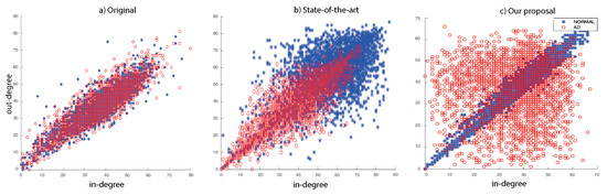 In the second experiment, we explore the in-degree/out-degree scatter for our dataset. In the state-of-the-art works, it is possible to obtain improved classification accuracy comparing (in directed or undirected approaches) Normal versus AD patients (see Figure 7b) with respect to the original data (see Figure 7a). Our method finds a better expansion of the asymmetries in in-out degree distributions, as we show in Figure 7c.