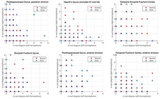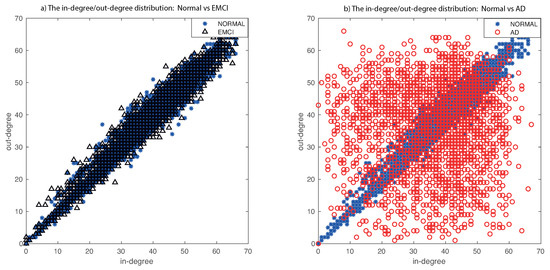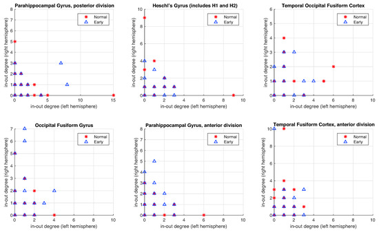 The main problems with the state-of-the-art methods are that they focus on two different approaches: (i) the comparison between early (EMCI) and late (LMCI) patients, obviating the interesting comparison between normal subjects and patients in an early stage of the disease [5,31], and (ii) the comparison is centered on subjects between normal and mild cognitive impairment (MCI, a join set of EMCI and LMCI), losing the emphasis on early detection [32,33,34,35,36]. The comparison between EMCI and normal subjects is difficult due to the almost complete overlap of the degree distributions. We compare normal vs EMCI (in Figure 8a) and normal vs Alzheimer’s disease (in Figure 8b) after applying our method. This figure (and previous one) shows the relationship between in-degree and out-degree links. In AD patients, there are areas of the brain where one of these degrees is bigger with respect to another degree. These asymmetries are reflected through an expanded distribution (in red). In the previous figure, we can compare the difference between healthy and AD patients of the original data, our method, and the state of the art (our method achieves a more expanded distribution). However, in this Figure 8, we show the main problem: to differentiate between Normal and patients in an early stage of the disease. Our method increases the scatter of the EMCI about the diagonal in comparison with the state-of-the-art methods, but it is still very difficult to compare distributions. Our hypothesis is that there exist more asymmetries in specific anatomical regions of the brain. For this reason, we perform a deeper analysis of the ROIs involved or implicated in the early phase of Alzheimer’s disease in the following experiments.