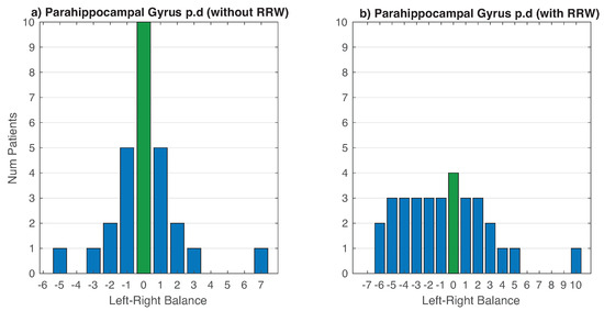 Finally, we show in Figure 12a the effect of using RRW in the balance between hemispheres. In Figure 12 left we can see how almost patients are concentrated in the point of balance (green bar). In contrast, if we applied RRW (Figure 12b), there is a sparser distribution (expanded asymmetries).