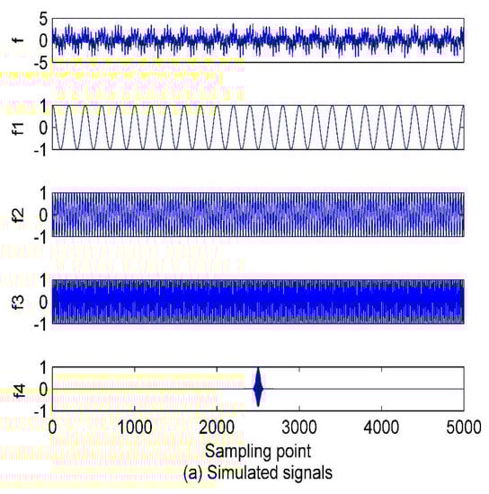 In order to validate the effectiveness of the EVMD algorithm, EMD, EEMD, and EVMD are respectively performed to decompose the simulated signals. The expression of the simulated signals is expressed as follows: