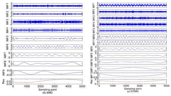 The time domain waveforms of simulated signals and decomposition results of empirical mode decomposition (EMD) and ensemble empirical mode decomposition (EEMD); (a) the raw simulated signals; (b) EMD method; (c) EEMD method.