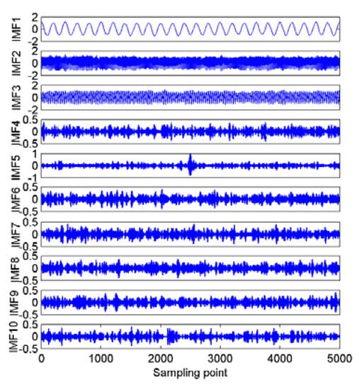 As shown in Figure 2, after the decomposition of the simulated signals by EMD, nine IMFs and one residual component are obtained. In case of the EEMD method, 12 IMFs and one residual component are separated in an orderly manner. Hence, we can set the mode number range to be (2~12), and calculate the variance of the center frequency of the obtained IMFs after each decomposition. Theoretically speaking, the optimum mode number K is the one which maximizes the variance, as the maximum variance means the most significant difference between the IMF center frequency. The variance curve of the IMF center frequency versus mode number K after the simulated signals analyzed by VMD is shown in Figure 3. As shown in Figure 3, the maximum variance corresponding to the mode number is 10, hence, K = 10 is considered as an optimum value and for K greater than it, the variance starts to decrease. This includes the insignificant difference between IMF center frequency and the occurrence of over-decomposition in VMD method. The decomposition results of the simulated signals decomposed by VMD using the obtained K is shown in Figure 4. Table 1 lists the decomposition layers corresponding to the distribution of the IMF center frequency. We can observe in Table 1 that when K = (2~8), the components of the simulated signal are not completely separated; when K is increased to be nine or 10, the simulated signals are completely separated. In addition, K = (11~12) can correctly realize the separation of the simulated signals, but more spurious components are generated. Based on the decomposition results, the proposed method of using the variance of IMF center frequency in this paper is significantly effective in locking the mode number of VMD. In order to further validate for the effective use of the method in the VMD algorithm, the correlation coefficients between corresponding IMF and simulated signals are calculated. The results are listed in Table 2.