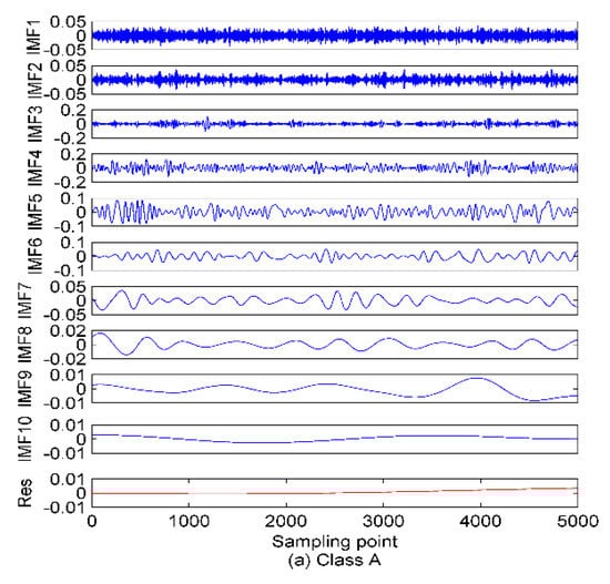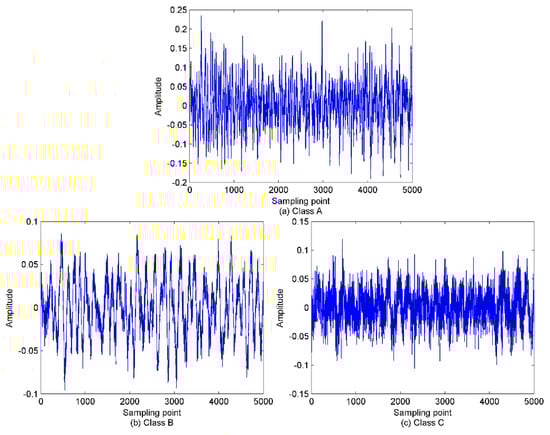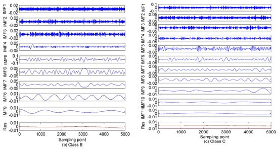 In this paper, the feature extraction method is evaluated for SRN by applying the proposed scheme to three types of SRN data randomly selected from a real measured dataset used in []. The SRN measured data used in this paper were recorded on the Atlantic coast in northwestern Spain (42°14′ N, 008°43.4′ W), at a depth of 10 m. The sampling frequency and data length for this measured data are set to 52.734 kHz and 5000, respectively. The selected three SNR samples are named in this paper as class A, B, and C, respectively. The time-domain waveforms of these SNR signals are shown in Figure 6. As explained in the first step of the proposed method, the mode number K will be calculated. The EMD and EEMD algorithms are first employed to decompose the SRN signals to calculate the mode number for VMD. The decomposition results of this step are shown in Figure 7 and Figure 8.