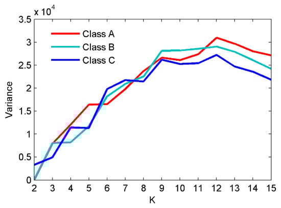 As seen in Figure 8, 12 IMFs and one residual component are obtained after EEMD of each type of SRN. For the sake of observation, K is set as (2~15) to calculate the variance of the IMF center frequency in VMD. The results of the variance analysis for the SRN signals are presented in Figure 9. The results show the optimal K is 12, and for K larger than it the variance sharply decreases, and that means the occurrence of over-decomposition in VMD. Figure 10 shows the decomposition results by EVMD.