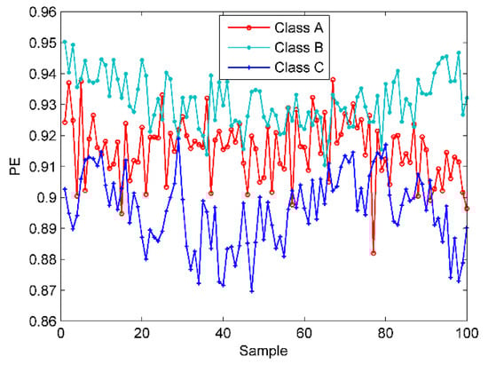 In this section, the proposed technique is applied to deal with the three types of SRN. In this SRN samples, there are 100 randomly selected samples in each class by 300 in total. In order to verify the effectiveness of the proposed method, we calculate the PE values of these samples. Figure 12 is the PE distribution of the three types of samples.