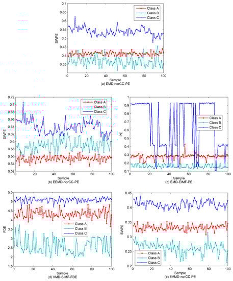 We can observe from Figure 13 that, concerning the EMD-norCC-PE algorithm, the three types of samples can be generally recognized, especially for category C, while there are still a large number of samples of class A and B that cross together. However, compared with the PE-based method, the discriminating ability was significantly improved. For EEMD-norCC-PE, class A and class B samples can be better separated, which produces better performance than EMD--norCC-PE. The EMD-EIMF-PE can generally differentiate the three types of samples, but several samples in class C intersect with the others and cannot be separated well. In contrast, the VMD-SIMF-FDE method can clearly distinguish these samples with fewer cross-samples, but the distance between the classes A and C is still small. Compared with the above algorithms, the proposed EVMD-norCC-PE can separate these SRN samples well, and the distance between classes increases significantly. While the EVMD-norCC-PE differs little from VMD-SIMF-PE in distinguishing these samples, owing to the inaccurate presentation of the scatter plots, it can only provide a qualitative analysis rather than quantitative comparison of algorithms such that the PSO-SVM multi-class classifier, in this case, is introduced for a more detailed analysis for the performance of these algorithms.