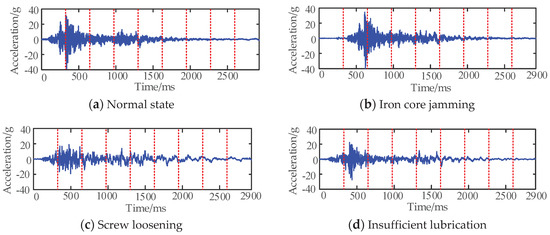 The object of signal acquisition and analysis is a LW9-72.5 type circuit breaker, which is a kind of high voltage alternating current SF6 circuit breaker with three ceramic columns; the rated voltage is 66 kV, the rated frequency is 50 Hz, and a CT20 spring operating mechanism is adopted. The piezoelectric acceleration sensor is used to detect the vibration signal, and the sensor is fixed on the mechanism box near the operating mechanism of the high voltage circuit breaker by bolts. NI9234 and NI9401 data acquisition cards are used to collect data. NI equipment and the related LabView software are only used for data acquisition [11,15,17]. Taking the time when the breaker receives the opening action command as the coordinate zero point, the total sampling time is 2900 ms, and the sampling rate is 25.6 ks/s. The starting point of the vibration signal recording under four mechanical states is the same as the time length of the acquisition signal. The vibration signals of high voltage circuit breakers in four different states during opening operation are measured respectively: normal state; iron core jamming; screw loosening; insufficient lubrication. The system starts to collect vibration signals from the time when the circuit breaker receives the opening command and carries out multiple opening operations under the same conditions. A total of 50 groups of measured vibration signals under four states are obtained.
