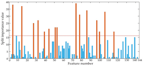 In the training process of LightGBM, the Split value of the feature represents the number of times the feature is used in the training, so the importance of the feature can be determined by calculating the Split value of the feature, and then the optimal feature subset can be constructed. First, we calculated the Split importance value of each feature of the original vibration signal after time-domain segmentation, and the calculation result is shown in Figure 2. After feature selection, the features belonging to the optimal feature subset were marked as orange, and the features not belonging to the optimal feature subset were marked as blue.