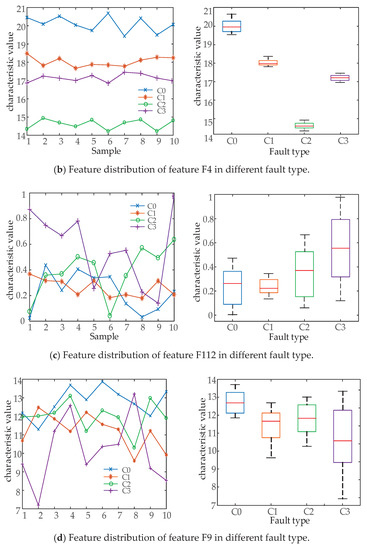 To verify the effectiveness of Split importance to measure the ability of feature classification, four features (F74, F4, F112, and F9) with the highest, higher, lower, and lowest importance values were selected in the original feature set Split importance ranking, F74 is the Waveform index of segment 2, F4 is the Peak value of segment 4, F112 is the Hartley entropy of segment 4, F9 is the Peak value of segment 9. We analyzed the distribution of eigenvalues of these four features in four different states. The equation of each feature can be found in Table 1. A total of 10 groups of data in each of four fault types were selected to calculate the eigenvalues, and the box line graph was constructed based on the distribution of the eigenvalues for display and analysis. The distribution of characteristics under different states of the circuit breaker is shown in Figure 3.