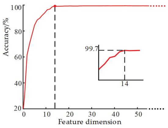 The features were arranged in descending order according to Split importance, the forward feature selection was carried out, and the features are added to the feature subset in turn. For each feature added, the recognition accuracy of the classifier under the feature subset was calculated. This process was repeated until all features were added to the feature set, and then the optimal feature subset was determined according to the highest recognition accuracy. In the whole process, the recognition accuracy of the classifier changed as shown in Figure 4. When the feature dimension was 14 dimensions, the LightGBM classification accuracy reached the highest accuracy. The related characteristics of the optimal feature subset are described in Table 2. The optimal feature contained four types of entropy features, which reflect the ability of entropy features to represent signal characteristics in a specific period.