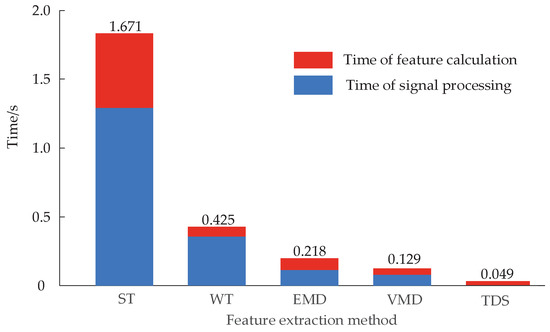 In order to analyze the efficiency of the new feature extraction method based on time-domain segmentation compared with the traditional method, the feature extraction time required by the edge side for the same group of vibration signals under different feature extraction methods is shown in Figure 9. According to the analysis of Figure 9, compared with ST, WT, EMD, and VMD, the new method has no signal processing time, and the overall feature extraction time is far lower than each feature extraction method based on signal processing. Therefore, it is of great practical significance to simplify the process of feature extraction and improve the efficiency of feature extraction while ensuring high classification accuracy.