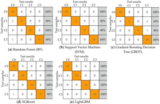 From the analysis of Figure 10, it can be seen that RF has an average accuracy of 92.5% in identifying C1 and C3; SVM has an average accuracy of 90.0% in identifying C1 and C2; GBDT has an average accuracy of 87.5% in identifying C1 and C2; XGBoost has an average accuracy of 97.5% in identifying C3, and LightGBM has an accuracy of 100% in identifying four states.