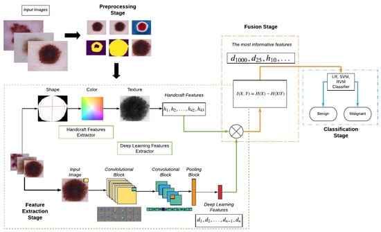 In this work, we propose a novel approach in the detection of a skin lesion among melanoma or nevus types, using handcraft features that depend on shape, color, and texture, which represent the ABCD rule (Asymmetry Borders-Colors-Dermatoscopic Structures), and combining them with deep learning features; these latter features were extracted using the transfer learning method as a generic feature extractor. At the next step, the most important features according to the Mutual Information (MI) metric features should be selected using the fusion technique, aiming at the best performance by taking into account the influences of both sets of features on the binary classification result.