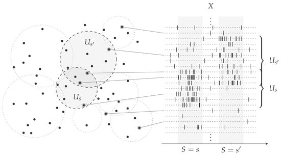 A computational model of sensory processing. We consider a population of N neurons, illustrated irrespective of the physical location as points in the plane on the left-hand side that is exposed to the presentation of a stimulus, which is modelled by a random variable S. The (measured) activity of this population, illustrated as spiking activity on the right-hand side over the presentation of two different values of the stimulus, is modelled by a vector-valued random variable . For every stimulus value s, we assume there exists a subset of the population, , depicted as circular regions on the plane, such that, intuitively, the neurons within this subpopulation are receptive to the particular stimulus value. Conversely, the neurons in the complement of that set in , , are assumed to be not receptive to that stimulus value and to activate independently according to a common noise profile. As an example, the sets for stimulus values s and are highlighted. Neurons from any of the two sets are shown to have an increased spiking activity during the presentation of the corresponding stimulus value. In contrast to this activity, others are shown to be rather sporadically active.