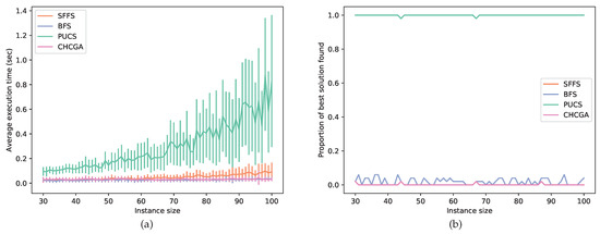 In this experiment, the instances had a larger size, ranging from 30 to 100 features; hence, they usually could not be solved by optimal algorithms. For this assay, we set SFS as the PUCS base algorithm and benchmarked this latter with the BFS, CHCGA and SFFS algorithms. Those three latter algorithms were chosen as baselines because each one belongs to a different family of feature selection algorithms, each family with a particular search strategy. In