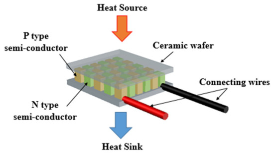 It is composed of types P and N semiconductors that are connected electrically in series as shown in Figure 2. The main advantage of such devices is that they do not have any moving parts and are reliable and silent. However, such devices have low efficiency (about 5%) [31]. Based on the Seebeck effect, when a thermoelectric generator is sandwiched between a heat source and heat sink, an induced voltage is generated [32]. The performance of the thermoelectric material is described by the “figure of merit” ZT. The figure of merit depends on the Seebeck coefficient S, electrical conductivity σ, and thermal conductivity k [28].