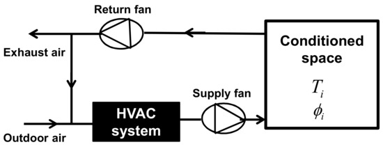 There are three main categories of HVAC systems: all-water, water–air, and all-air systems. An all-air system is referred to as such because the temperature and humidity are controlled only by supplying air to the conditioned space. Figure 3 shows a schematic of the operational mode of this category of HVAC system [30].