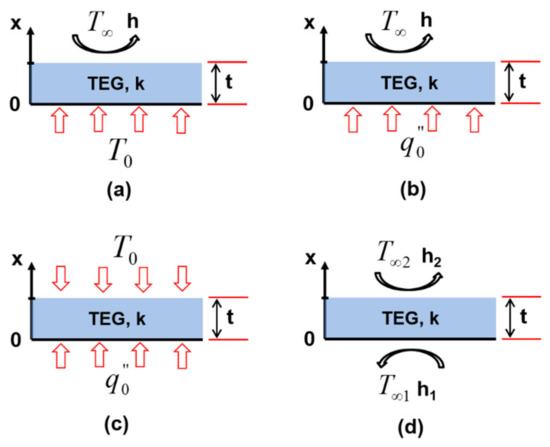 Firstly, in configuration one (Figure 4a), the TEG of thickness t and thermal conductivity is exposed to a constant temperature at its hot side and simultaneously cooled by air with a convective coefficient and temperature .