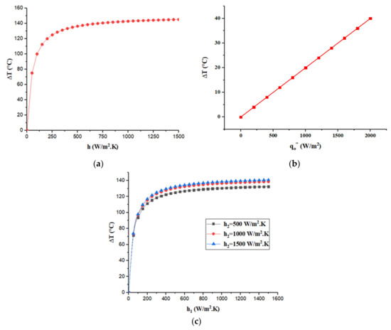 Figure 5a shows that for configuration 1 the temperature difference achieved 145 °C at 1500 W/m2 K convection heat transfer coefficient. While, Figure 5b presents the variation of temperature difference with respect to heat flux for both configurations 2 and 3. The maximum temperature difference obtained is 40 °C which is lower than configuration 1 and configuration 4 which is presented in Figure 5c. Regarding configuration 4 the maximum temperature difference achieved is 140 °C at h1 and h2 of 1500 W/m2 K.