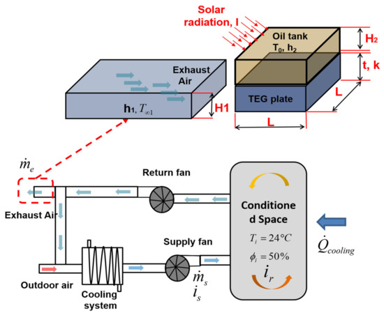As mentioned above, the parametric investigation uncovered that configuration four conveys the highest temperature gradient compared to the other configurations. Therefore, an innovative system is investigated by using solar radiation and the exhaust airflow (Figure 6). The proposed system is composed of an oil tank appended to its bottom flat plate where various TEG modules are placed in series; however, the upper transparent surface is visible to sun radiation. Moreover, the exhausted air of HVAC system is used to cool the bottom surface of the plate, contrarily, the upper TEG modules are heated by the hot oil which heated due to solar radiation. Therefore, a temperature gradient will be induced and will be converted to electrical power.