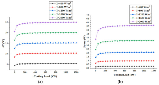 As shown in Figure 7, the temperature difference across each TEG module increases slightly when the cooling load is increased and increases significantly with increasing solar radiation. As illustration for a solar radiation of 400 W/m2 when the cooling load varies from 20 to 500 kW, the temperature difference across each TEG module varies from 4.5 to 5.5 °C and the power generated by the assembly varies from 0.18 to 0.27 W (50% increase in power generated). For a solar radiation of 2000 W/m2 (for applications with solar concentration) when the cooling load varies from 20 to 500 kW, the temperature difference across each TEG module varies from 20.5 to 25 °C and the power generated by the assembly varies from 3.8 to 5.64 W (48% increase in power).