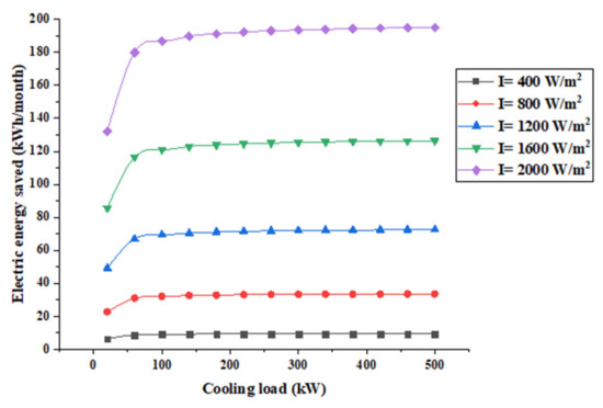 Figure 8 shows the electric energy saved per month. It shows that when solar radiation is 400 W/m2 and the cooling load varies from 20 to 500 kW, the energy saved varies from 6.4 kWh/month to 9.4 kWh/month. This increases with an increase in solar radiation to 2000 W/m2 and when the cooling load varies from 20 to 500 kW, the energy saved varies from 132 kWh/month to 195 kWh/month. This means that varying the solar radiation has a high impact of energy saved compared to a low impact of the cooling load.