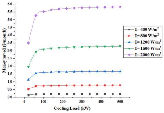 Figure 9 presents the money saved as a function of the cooling load for different solar radiation.