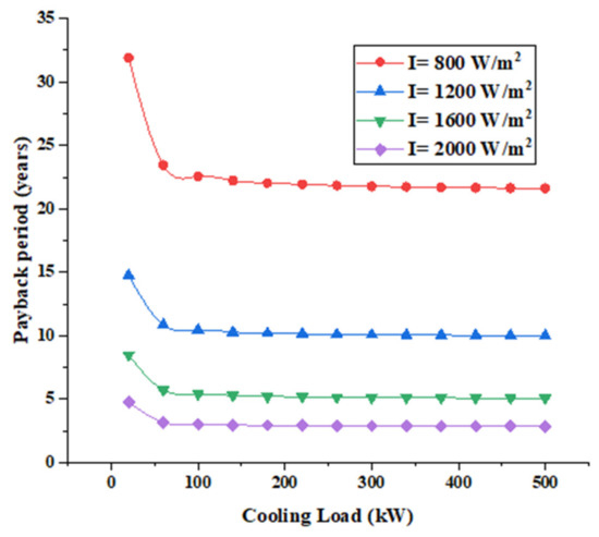 Figure 10 shows that when the solar radiation is 2000 W/m2, the payback period is about 3 years which increases to about 5 years when the solar radiation is 1600 W/m2. The reduction of solar radiation by 20% leads to a 66% increase in the payback period. The payback period of the system when the solar radiation is 400 W/m2 is very high (about 77 years) that’s why it is not presented in Figure 10 above. In addition, when the solar radiation is more than 1200 W/m2 the payback period is less than 15 years. The most acceptable payback period is for solar radiation more than 1600 W/m2 in which it is less than 5 years with cooling load greater than 100 kW.