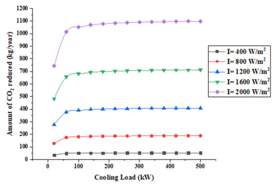It also shows that the system can reduce about 1 ton yearly at a solar radiation of 2000 W/m2. Whereas, when the solar radiation is 1200 W/m2 the amount of CO2 gas reduced is about 0.5 ton/year.