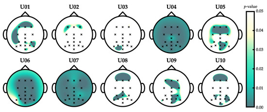 Wilcoxon signed-rank test p-values that show significant differences (i.e., from 0 to 0.05) between control and non-control SampEn features in the optimization dataset. Hyperparameters were fixed to their optimal values. Note that p-values were adjusted using the Benjamini–Hochberg False Discovery Rate (FDR) step-up procedure.