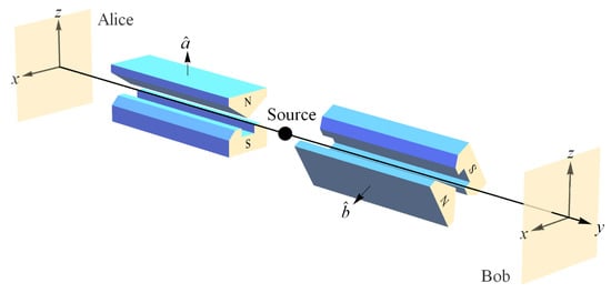 Now we can complete our analogy with SR above. In order to satisfy conservation of spin angular momentum per Axiom 1 for any given trial when Alice and Bob are making different measurements, i.e., when they are in different reference frames, it would be necessary for Bob or Alice to measure some fraction, . For example, if Alice measured at for an state (in the plane of symmetry) and Bob made his measurement (in the plane of symmetry) at , then Bob’s outcome would need to be (Figure 10). In that case, we would know that Alice measured the “true” spin angular momentum of her particle while Bob only measured a component of the “true” spin angular momentum for his particle. Thus, Alice’s SG magnet orientation would definitely constitute a “preferred reference frame” in violation of Axiom 2.