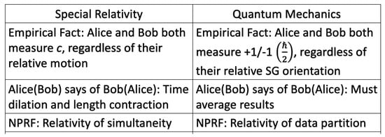 Comparing special relativity with quantum mechanics according to no preferred reference frame (Axiom 2). Alice and Bob both measure the same speed of light c regardless of their relative motion per NPRF, therefore Alice(Bob) may claim that Bob’s(Alice’s) length and time measurements are erroneous and need to be corrected (length contraction and time dilation). Likewise, because Alice and Bob both measure the same values for spin angular momentum regardless of their relative SG magnet orientation per NPRF, Alice(Bob) may claim that Bob’s(Alice’s) individual values are erroneous and need to be corrected (averaged, Figure 7, Figure 8, Figure 9 and Figure 10). In both cases, NPRF resolves the mystery it creates. In SR, the apparently inconsistent results can be reconciled via the relativity of simultaneity. That is, Alice and Bob each partition spacetime per their own equivalence relations (per their own reference frames), so that equivalence classes are their own surfaces of simultaneity and these partitions are equally valid per NPRF. This is completely analogous to QM, where the apparently inconsistent results per the Bell spin states arising because of NPRF can be reconciled by NPRF via the “relativity of data partition”. That is, Alice and Bob each partition the data per their own equivalence relations (per their own reference frames), so that equivalence classes are their own and data events and these partitions are equally valid.