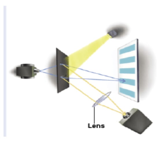 Using pictures from Hillmer and Kwiat [60] we start with a particle interference pattern (Figure 12) then we scatter photons off the particles after they have passed through the slits(s) (Figure 13) and finally we erase the which-way information obtained by the scattered photons by inserting a lens (Figure 14).