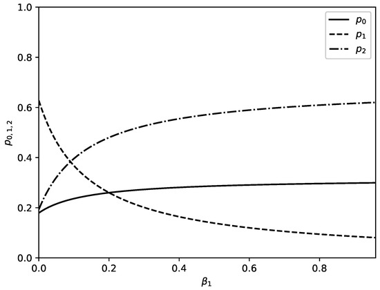Figure 4 shows influence of increasing value of the parameter on probabilities . Parameter accounts for additional outflow of substance from node 1 to node 2 because of some extra reason (in the theory of migration this extra reason can be preference of migrants which prefer to migrate to country 2 instead to stay in country 1). Increased value of leads to decrease of percentage of substance in the node 1 and to increase of percentage of substance which is located in node 2. For the values of parameters as in Figure 4 there is an additional change: percentage of substance in node 0 increases too.