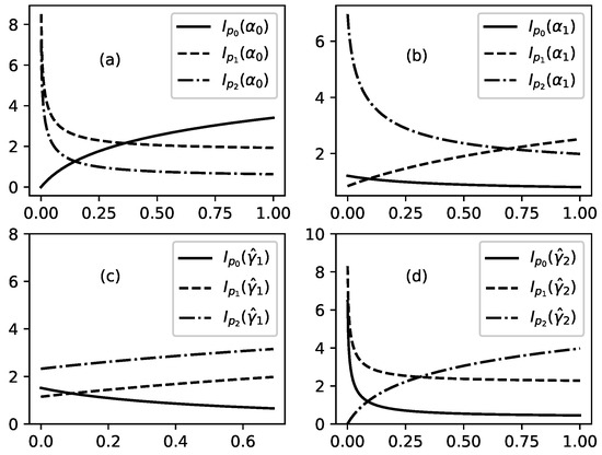 Information measures (solid lines), (dashed lines), and (dot-dashed lines) as functions of selected parameter of the problem when all other parameters are fixed. (a): Dependence of , ; on for fixed values of other parameters as follows: , , , . (b): Dependence of , ; on for fixed values of other parameters as follows: , , , . (c): Dependence of , ; on for fixed values of other parameters as follows: , , , . (d): Dependence of , ; on for fixed values of other parameters as follows: , , , .