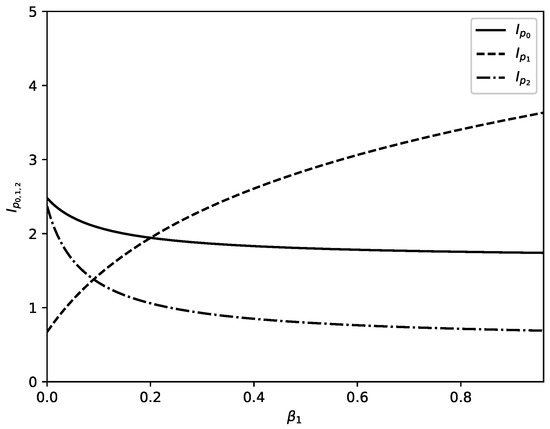 Figure 5 and Figure 6 show influence of changing values of parameters of problem on the values of information measures , , and for nodes of studied channel. Figure 5a shows changes in the information measures with increasing value of parameter when values of all other parameters of problem are fixed. We observe that the value of increases with increasing value of and values of and decrease with increasing value of . This is because of the redistribution of percentage of substance in nodes 0, 1 and 2 with increasing value of . Because of increasing outflow from node 0 the percentage of total substance located in this node decreases. The event associated with information measure I for node 0 becomes rare and occurrence of this event carries larger information. The percentage of substance in nodes 1 and 2 increases with increasing value of . The event associated with information measure I becomes more frequent and this leads to decreasing information associated with occurrence of this event in nodes 1 and 2. Similar is the situation in Figure 5b where increasing value of parameter (accounting for outflow of substance from node 1 to node 2) leads to increasing percentage of substance in nodes 0 and 2 and decreasing percentage of substance in node 2. The information associated with occurrence of event of interest in node 2 increases and information associated with occurrence of event of interest in nodes 0 and 2 decreases.