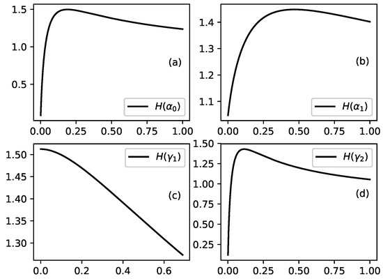 Shannon information measure as function of selected parameters when the other parameters of probability distribution are fixed. (a): for fixed values of other parameters as follows: , , , . (b): for fixed values of other parameters as follows: , , , . (c): ) for fixed values of other parameters as follows: , , , . (d): for fixed values of other parameters as follows: , , , .