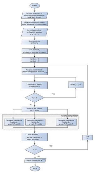 Knowing the values of the parameters and I we can determine the number of the objective function calls during the algorithm execution. This number is . The Figure 1 presents the block diagram of the RealACO algorithm.
