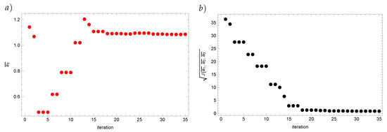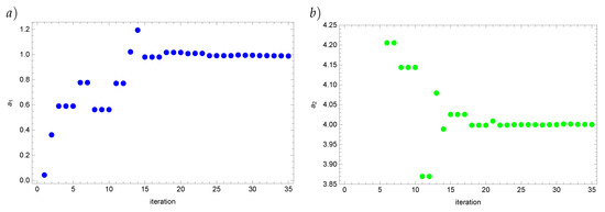 In order to minimize the functional (7), the Real Ant Colony Optimization algorithm [16] is being used. The inspiration for the algorithm was the swarming behavior of ants in nature. In the presented algorithm, the role of the solutions are being played by the pheromone spots in the number of L. At the beginning those spots are randomly placed in the considered region. Next, they are being sorted by the quality and certain probabilities are being assigned to them. The better the solution is, the higher the probability of choosing it is. This way we create the set of solutions. In every iteration each of M ants construct one new solution (new pheromone spot) using the probability density function (Gauss function). First the ant chooses with the certain probability the solution that will be transformed. This probability is dependent on the parameter q of the algorithm. If value of q is small then the choice of the best solution is preferred and the higher the value of q is, the more similar to each other the probabilities of choosing any solution are. When the solution is chosen then the ant samples its neighborhood using the Gauss function with the parameters and , where is dependent on the parameter . This parameter is responsible for the disappearance of the pheromone trace. The smaller value of is, the faster the algorithm converges to its best solution at the expense of further exploration of the region. Then, the set of solutions is updated with the new solutions—the new and previous solutions are being sorted by quality and the M of the worst solutions get rejected. Moreover, the algorithm was adapted for parallel computing. Mathematical fundaments and results concerning the convergence of the different versions of the ACO algorithm are included in [24,25,26,27]. Based on the analysis of the papers of various authors, see for example [28,29,30,31,32], as well as on the computation carried out by us (for example [7,17,20,22,31]) we come to the conclusion that using the artificial intelligence algorithms (ACO, RACO, RACO, IRM, etc.) in most cases does not require the application of the explicit regulatory procedures. There is no mathematical proof for that, only the empirical data. For the examples presented in the paper we have known the exact solutions so we could compare the approximate solutions with them. The reconstruction errors of the reconstructed parameters generally do not exceed the input data errors. They are slightly larger in some cases. It follows that the results obtained for the disturbed input data remain stable. In order to describe the algorithm we are introducing the notation